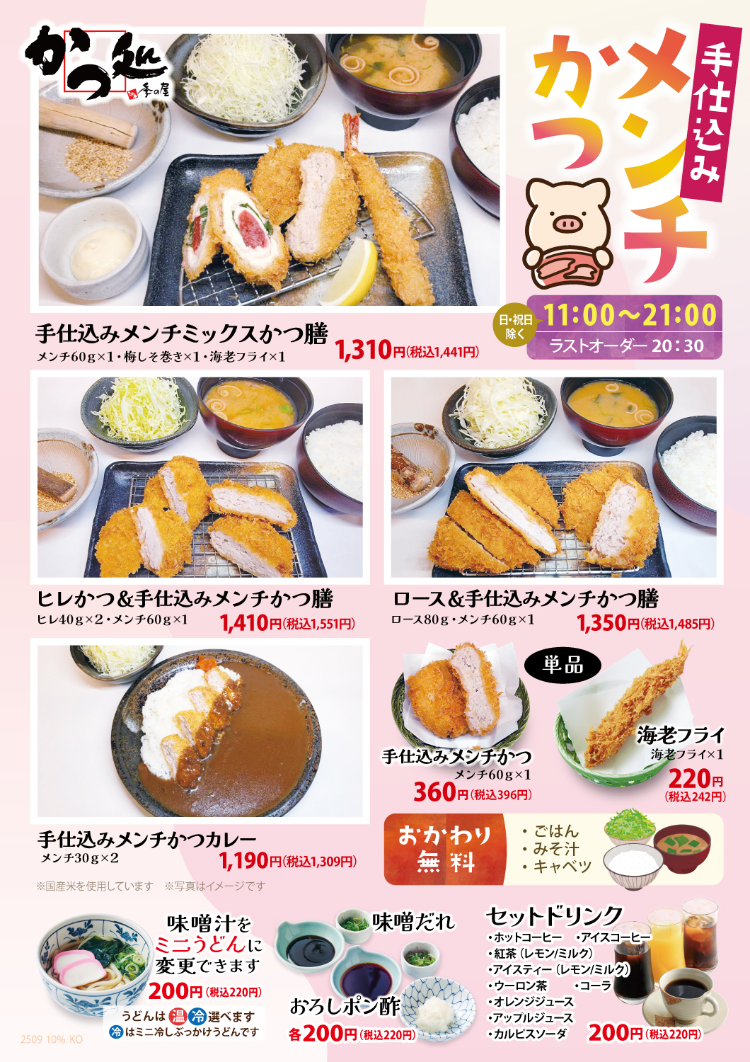 かつ処季の屋マルナカ高知インター店では、サクサク衣とジューシーな旨みが自慢の「手仕込みメンチかつ」メニューをご用意しております。