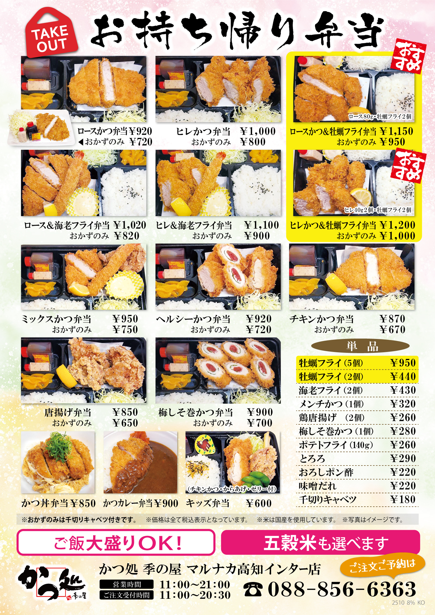 かつ処季の屋 マルナカ高知インター店では、店内メニューでご好評いただいている『牡蠣フライ~岡山県邑久産~』を、このたびお弁当メニューもご用意しました。