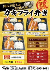 かつ処季の屋イオンタウン茨木太田店では、店内メニューでご好評いただいている『牡蠣フライ~岡山県邑久産~』を、このたびお弁当メニューもご用意しました。