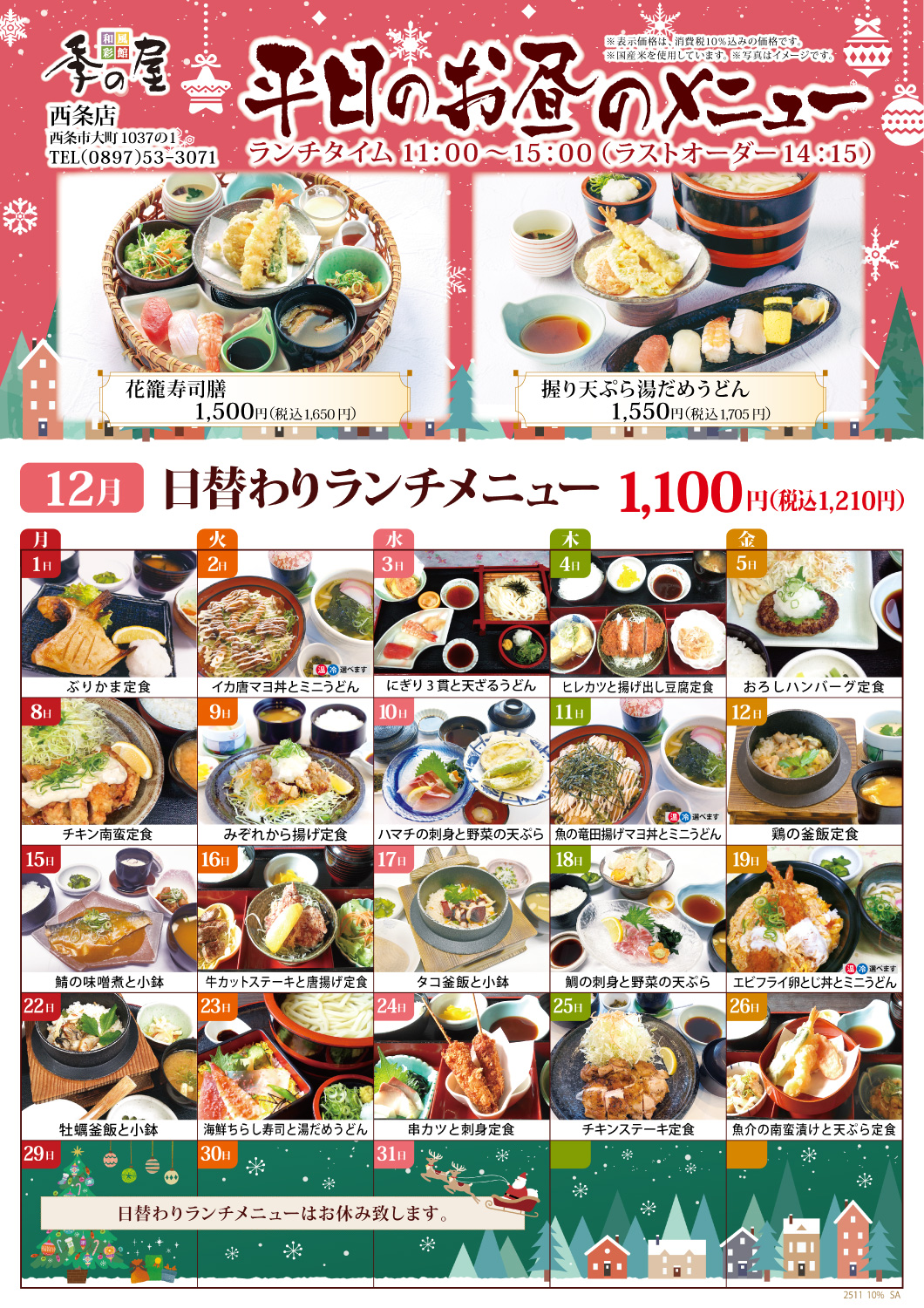 12月日替わりランチカレンダー公開 【和風彩館季の屋西条】