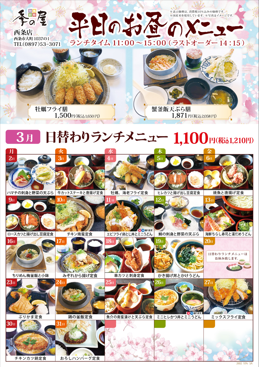 3月の日替わりランチカレンダー公開 【和風彩館季の屋西条】