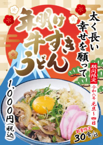 豊浜サービスエリア(下り線)では、令和八年元旦から四日までの期間限定で「年明け牛すきうどん」をご提供いたします。