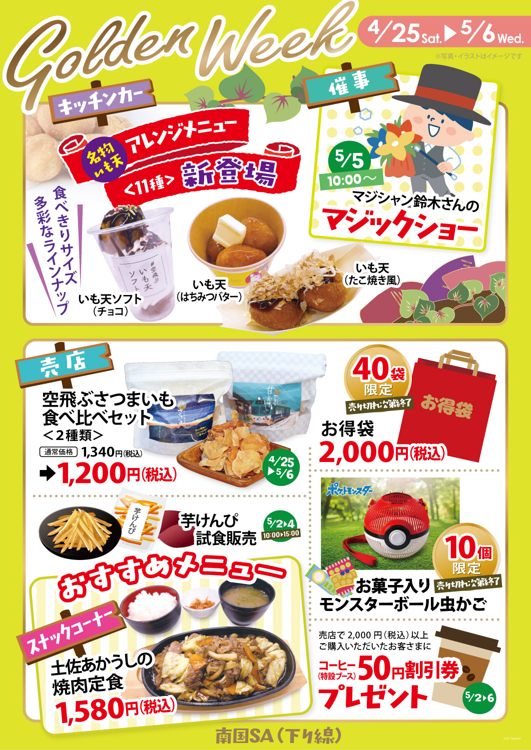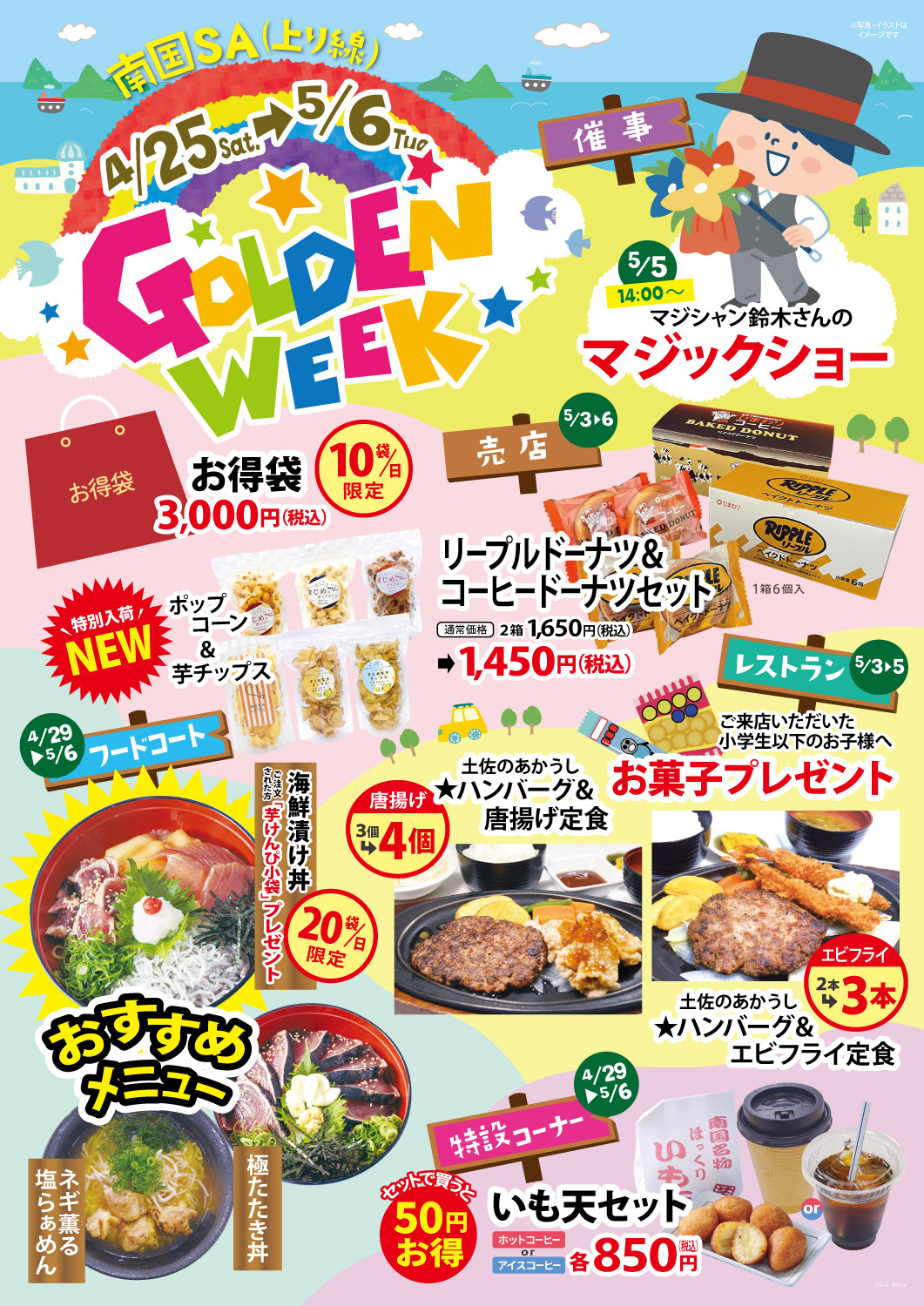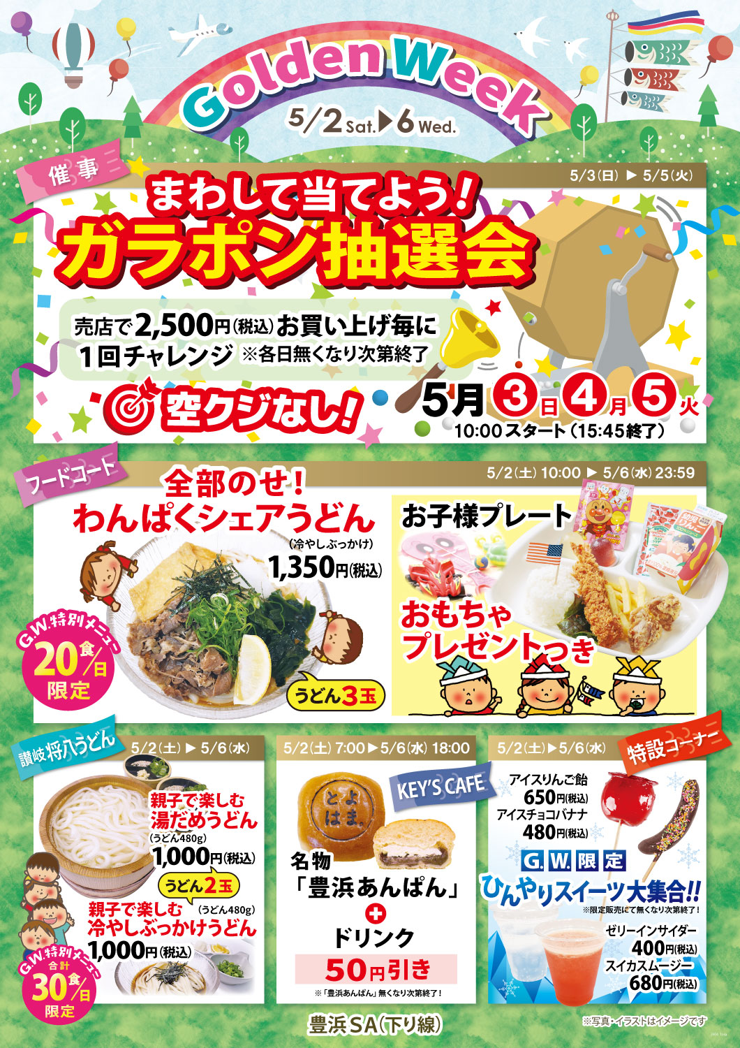 豊浜SA下り線・南国SA上り線・南国SA下り線の3店舗では、ゴールデンウィーク期間中に特別イベントを開催いたします。 ドライブの合間にお楽しみいただける企画や、この時期だけの限定商品やメニューなど、各店舗ならではの内容をご用意しました。
