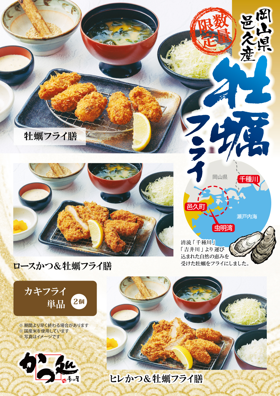 かつ処季の屋は、9月26日より旬の牡蠣を使用したメニューをかつ処季の屋全店で販売します。
